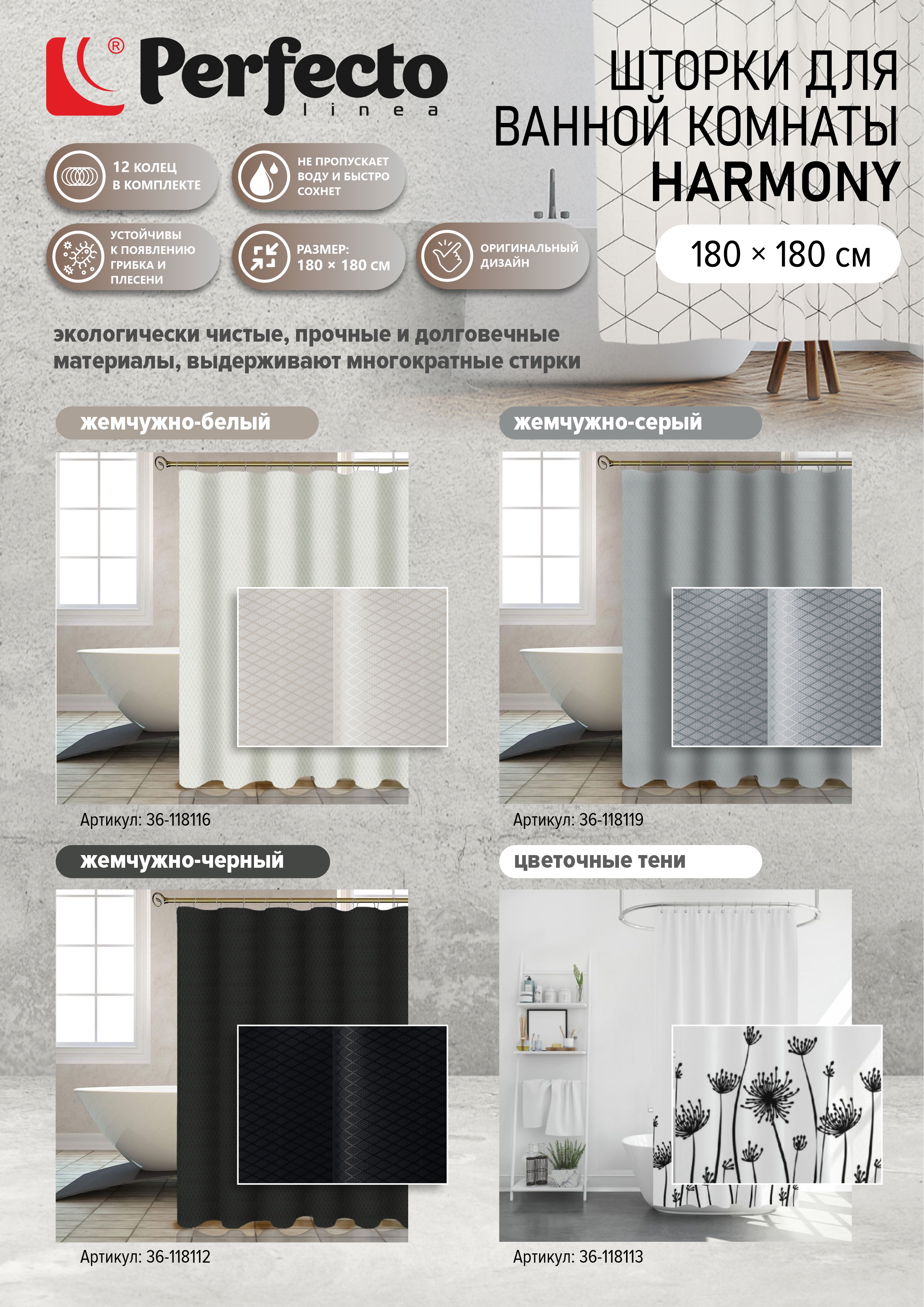Шторки для ванной (12 колец в комплекте), Harmony